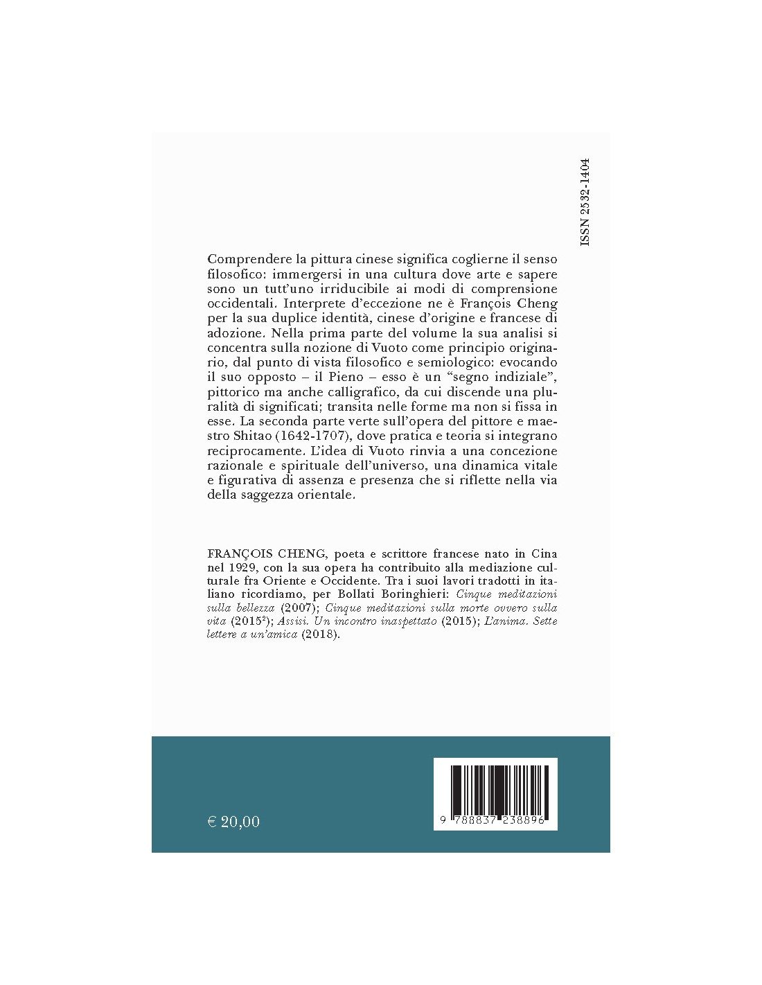 Comprendere la pittura cinese significa coglierne il senso filosofico: immergersi in una cultura dove arte e sapere sono un tutt’uno irriducibile ai modi di comprensione occidentali. Interprete d’eccezione ne è François Cheng per la sua duplice identità, cinese d’origine e francese di adozione. Nella prima parte del volume la sua analisi si concentra sulla nozione di Vuoto come principio originario, dal punto di vista filosofico e semiologico: evocando il suo opposto – il Pieno – esso è un “segno indiziale”, pittorico ma anche calligrafico, da cui discende una pluralità di significati; transita nelle forme ma non si fissa in esse. La seconda parte verte sull’opera del pittore e maestro Shitao (1642-1707), dove pratica e teoria si integrano reciprocamente. L’idea di Vuoto rinvia a una concezione razionale e spirituale dell’universo, una dinamica vitale e figurativa di assenza e presenza che si riflette nella via della saggezza orientale.