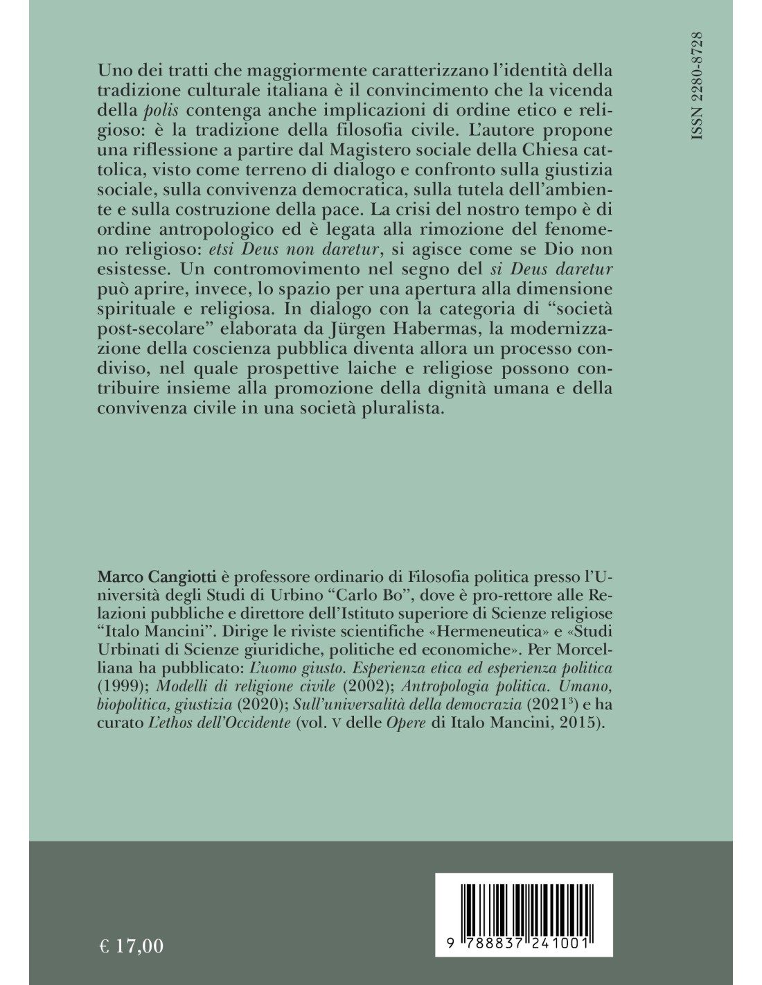 Uno dei tratti che maggiormente caratterizzano l’identità della tradizione culturale italiana è il convincimento che la vicenda della polis contenga anche implicazioni di ordine etico e religioso: è la tradizione della filosofia civile. L’autore propone una riflessione a partire dal Magistero sociale della Chiesa cattolica, visto come terreno di dialogo e confronto sulla giustizia sociale, sulla convivenza democratica, sulla tutela dell’ambiente e sulla costruzione della pace. La crisi del nostro tempo è di ordine antropologico ed è legata alla rimozione del fenomeno religioso: etsi Deus non daretur, si agisce come se Dio non esistesse. Un contromovimento nel segno del si Deus daretur può aprire, invece, lo spazio per una apertura alla dimensione spirituale e religiosa. In dialogo con la categoria di “società post-secolare” elaborata da Jürgen Habermas, la modernizzazione della coscienza pubblica diventa allora un processo condiviso, nel quale prospettive laiche e religiose possono contribuire insieme alla promozione della dignità umana e della convivenza civile in una società pluralista.