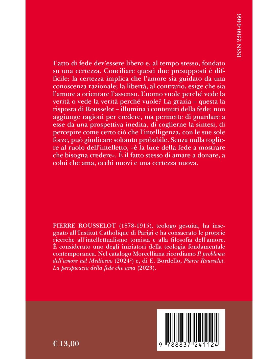 Pierre Rousselot (1878-1915), teologo gesuita, ha insegnato all’Institut Catholique di Parigi e ha consacrato le proprie ricerche all’intellettualismo tomista e alla filosofia dell’amore. E' considerato uno degli iniziatori della teologia fondamentale contemporanea. Nel catalogo Morcelliana ricordiamo Il problema dell’amore nel Medioevo (2024 2ed.) e, di E. Bordello, Pierre Rousselot. La perspicacia della fede che ama (2023).