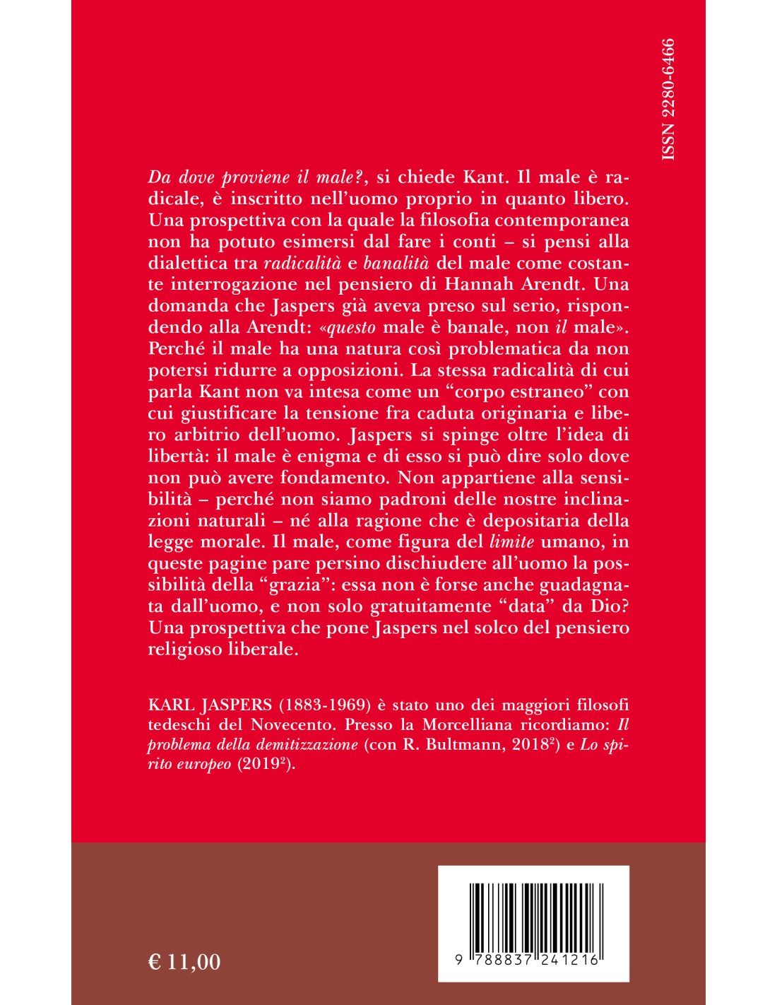 Da dove proviene il male?, si chiede Kant. Il male è radicale, è inscritto nell’uomo proprio in quanto libero. Una prospettiva con la quale la filosofia contemporanea non ha potuto esimersi dal fare i conti – si pensi alla dialettica tra radicalità e banalità del male come costante interrogazione nel pensiero di Hannah Arendt. Una domanda che Jaspers già aveva preso sul serio, rispondendo alla Arendt: «questo male è banale, non il male». Perché il male ha una natura così problematica da non potersi ridurre a opposizioni. La stessa radicalità di cui parla Kant non va intesa come un “corpo estraneo” con cui giustificare la tensione fra caduta originaria e libero arbitrio dell’uomo. Jaspers si spinge oltre l’idea di libertà: il male è enigma e di esso si può dire solo dove non può avere fondamento. Non appartiene alla sensibilità – perché non siamo padroni delle nostre inclinazioni naturali – né alla ragione che è depositaria della legge morale. Il male, come figura del limite umano, in queste pagine pare persino dischiudere all’uomo la possibilità della “grazia”: essa non è forse anche guadagnata dall’uomo, e non solo gratuitamente “data” da Dio? Una prospettiva che pone Jaspers nel solco del pensiero religioso liberale.