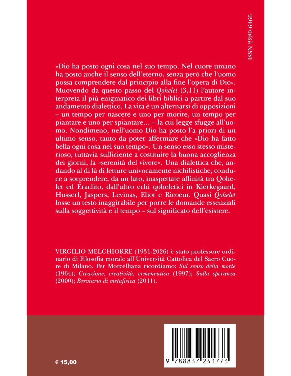 «Dio ha posto ogni cosa nel suo tempo. Nel cuore umano ha posto anche il senso dell’eterno, senza però che l’uomo possa comprendere dal principio alla fine l’opera di Dio». Muovendo da questo passo del Qohelet (3,11) l’autore interpreta il più enigmatico dei libri biblici a partire dal suo andamento dialettico. La vita è un alternarsi di opposizioni – un tempo per nascere e uno per morire, un tempo per piantare e uno per spiantare… – la cui legge sfugge all’uomo. Nondimeno, nell’uomo Dio ha posto l’a priori di un ultimo senso, tanto da poter affermare che «Dio ha fatto bella ogni cosa nel suo tempo». Un senso esso stesso misterioso, tuttavia sufficiente a costituire la buona accoglienza dei giorni, la «serenità del vivere». Una dialettica che, andando al di là di letture univocamente nichilistiche, conduce a sorprendere, da un lato, inaspettate affinità tra Qohelet ed Eraclito, dall’altro echi qoheletici in Kierkegaard, Husserl, Jaspers, Levinas, Eliot e Ricoeur. Quasi Qohelet fosse un testo inaggirabile per porre le domande essenziali sulla soggettività e il tempo – sul significato dell’esistere.