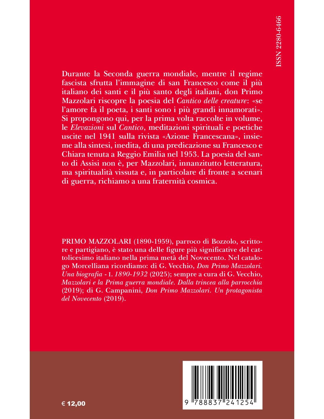 Durante la Seconda guerra mondiale, mentre il regime fascista sfrutta l’immagine di san Francesco come il più italiano dei santi e il più santo degli italiani, don Primo Mazzolari riscopre la poesia del Cantico delle creature: «se l’amore fa il poeta, i santi sono i più grandi innamorati». Si propongono qui, per la prima volta raccolte in volume, le Elevazioni sul Cantico, meditazioni spirituali e poetiche uscite nel 1941 sulla rivista «Azione Francescana», insieme alla sintesi, inedita, di una predicazione su Francesco e Chiara tenuta a Reggio Emilia nel 1953. La poesia del santo di Assisi non è, per Mazzolari, innanzitutto letteratura, ma spiritualità vissuta e, in particolare di fronte a scenari di guerra, richiamo a una fraternità cosmica.