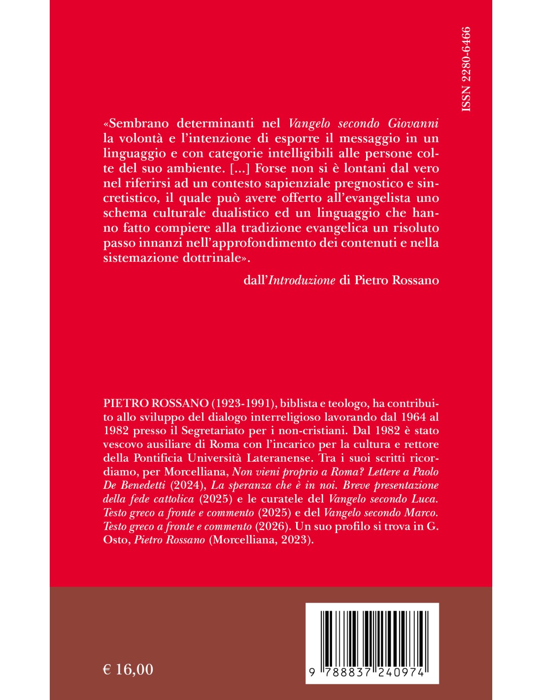 Pietro Rossano (1923-1991), biblista e teologo, ha contribuito allo sviluppo del dialogo interreligioso lavorando dal 1964 al 1982 presso il Segretariato per i non-cristiani. Dal 1982 è stato vescovo ausiliare di Roma con l’incarico per la cultura e rettore della Pontificia Università Lateranense. Tra i suoi scritti ricordiamo, per Morcelliana, Non vieni proprio a Roma? Lettere a Paolo De Benedetti (2024), La speranza che è in noi. Breve presentazione della fede cattolica (2025) e le curatele del Vangelo secondo Luca. Testo greco a fronte e commento (2025) e del Vangelo secondo Marco. Testo greco a fronte e commento (2026). Un suo profilo si trova in G. Osto, Pietro Rossano (Morcelliana, 2023).