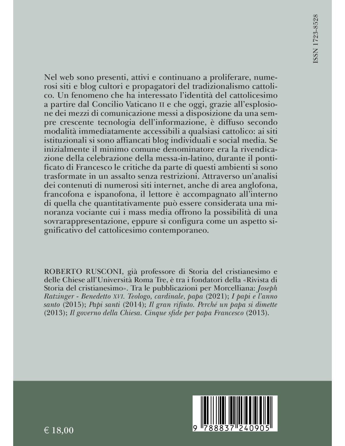 Nel web sono presenti, attivi e continuano a proliferare, numerosi siti e blog cultori e propagatori del tradizionalismo cattolico. Un fenomeno che ha interessato l’identità del cattolicesimo a partire dal Concilio Vaticano II e che oggi, grazie all’esplosione dei mezzi di comunicazione messi a disposizione da una sempre crescente tecnologia dell’informazione, è diffuso secondo modalità immediatamente accessibili a qualsiasi cattolico: ai siti istituzionali si sono affiancati blog individuali e social media. Se inizialmente il minimo comune denominatore era la rivendicazione della celebrazione della messa-in-latino, durante il pontificato di Francesco le critiche da parte di questi ambienti si sono trasformate in un assalto senza restrizioni. Attraverso un’analisi dei contenuti di numerosi siti internet, anche di area anglofona, francofona e ispanofona, il lettore è accompagnato all’interno di quella che quantitativamente può essere considerata una minoranza vociante cui i mass media offrono la possibilità di una sovrarappresentazione, eppure si configura come un aspetto significativo del cattolicesimo contemporaneo.