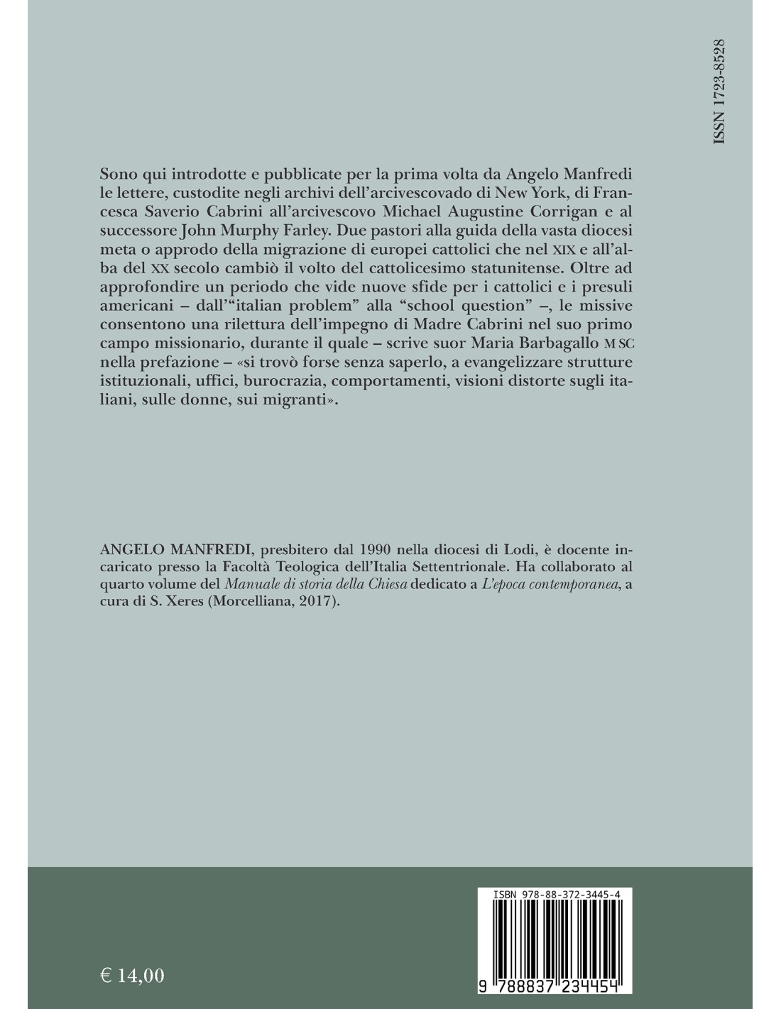 Sono qui introdotte e pubblicate per la prima volta da Angelo Manfredi le lettere, custodite negli archivi dell’arcivescovado di New York, di Francesca Saverio Cabrini all’arcivescovo Michael Augustine Corrigan e al successore John Murphy Farley. Due pastori alla guida della vasta diocesi meta o approdo della migrazione di europei cattolici che nel XIX e all’alba del XX secolo cambiò il volto del cattolicesimo statunitense. Oltre ad approfondire un periodo che vide nuove sfide per i cattolici e i presuli americani – dall’“italian problem” alla “school question” –, le missive consentono una rilettura dell’impegno di Madre Cabrini nel suo primo campo missionario, durante il quale – scrive suor Maria Barbagallo MSC nella prefazione – «si trovò forse senza saperlo, a evangelizzare strutture istituzionali, uffici, burocrazia, comportamenti, visioni distorte sugli italiani, sulle donne, sui migranti».