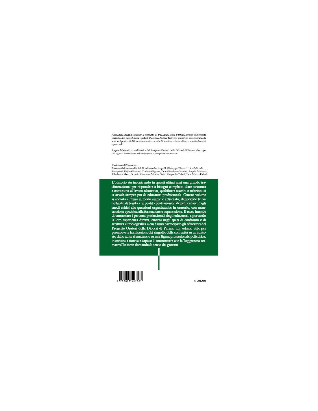 L’oratorio sta incontrando in questi ultimi anni una grande trasformazione: per rispondere a bisogni complessi, dare struttura e continuità al lavoro educativo, qualificare scambi e relazioni ci si avvale sempre più di educatori professionali. Questo volume si accosta al tema in modo ampio e articolato, delineando le coordinate di fondo e il profilo professionale dell’educatore, dagli snodi critici alle questioni organizzative in oratorio, con un’attenzione specifica alla formazione e supervisione. Il testo intende documentare i percorsi professionali degli educatori, riportando la loro esperienza diretta, emersa negli spazi di confronto e di scrittura autobiografica a cui hanno partecipato gli educatori del Progetto Oratori della Diocesi di Parma. Un volume utile per promuovere la riflessione dei singoli e delle comunità su un contesto dalle tante sfumature e su una figura professionale poliedrica, in continua ricerca e capace di intercettare con la “leggerezza animativa” le tante domande di senso dei giovani.