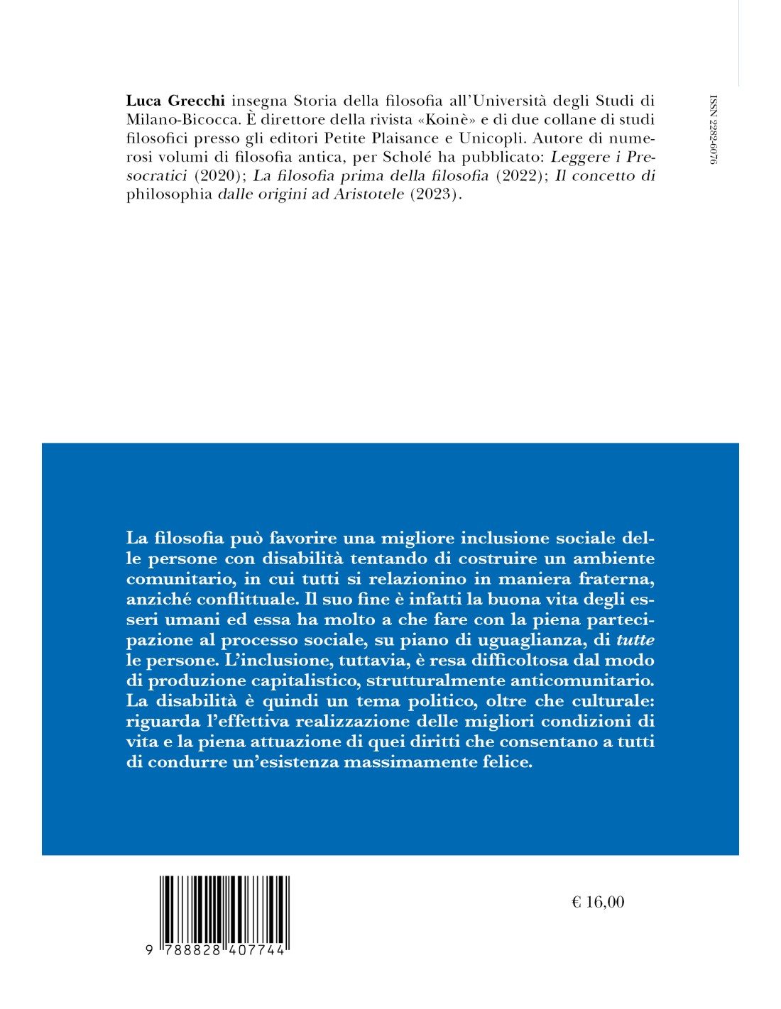 Luca Grecchi insegna Storia della filosofia all’Università degli Studi di Milano-Bicocca. è direttore della rivista «Koinè» e di due collane di studi filosofici presso gli editori Petite Plaisance e Unicopli. Autore di numerosi volumi di filosofia antica, per Scholé ha pubblicato: Leggere i Presocratici (2020); La filosofia prima della filosofia (2022); Il concetto di philosophia dalle origini ad Aristotele (2023).