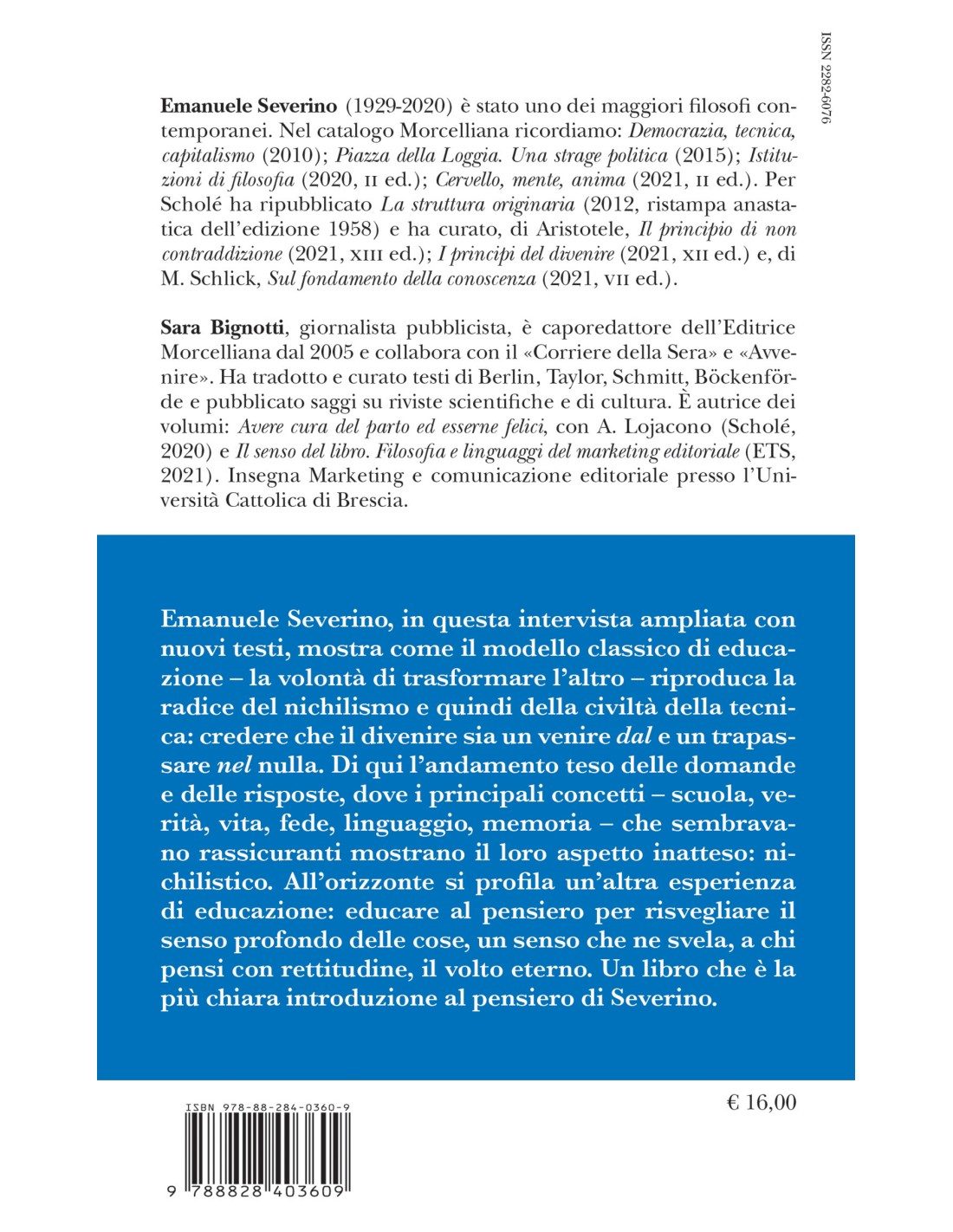 Emanuele Severino, in questa intervista ampliata con nuovi testi, mostra come il modello classico di educazione – la volontà di trasformare l’altro – riproduca la radice del nichilismo e quindi della civiltà della tecnica: credere che il divenire sia un venire dal e un trapassare nel nulla. Di qui l’andamento teso delle domande e delle risposte, dove i principali concetti – scuola, verità, vita, fede, linguaggio, memoria – che sembravano rassicuranti mostrano il loro aspetto inatteso: nichilistico. All’orizzonte si profila un’altra esperienza di educazione: educare al pensiero per risvegliare il senso profondo delle cose, un senso che ne svela, a chi pensi con rettitudine, il volto eterno. Un libro che è la più chiara introduzione al pensiero di Severino.