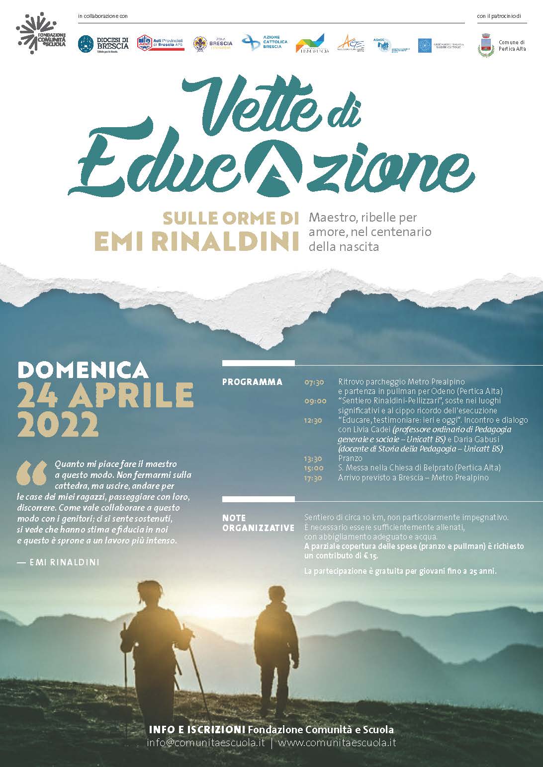 Emiliano Rinaldini (Brescia, 1922 - Pertica Alta, 1945) dopo avere conseguito il diploma di maestro si dedicò con passione all’insegnamento. La sua formazione cristiana lo portò a contatto con figure come padre Giulio Bevilacqua, padre Carlo Manziana, don Giuseppe Tedeschi e Vittorino Chizzolini, che lo invitò a collaborare con l’Editrice La Scuola. Tra il 1943 e il 1944 abbracciò la Resistenza nelle formazioni partigiane «Fiamme Verdi» e nel febbraio del 1945 fu catturato, torturato e ucciso dai militi fascisti.