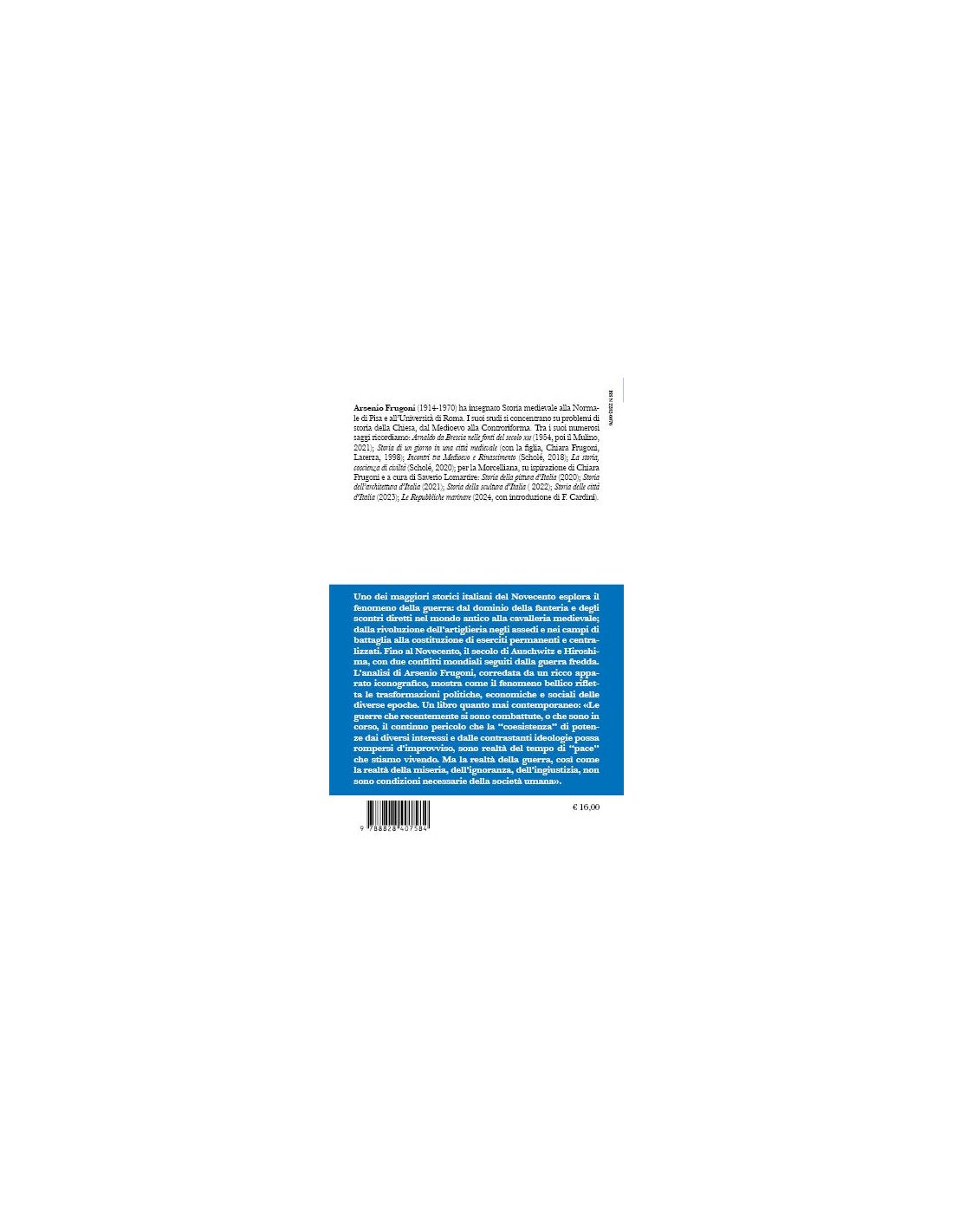 Uno dei maggiori storici italiani del Novecento esplora il fenomeno della guerra: dal dominio della fanteria e degli scontri diretti nel mondo antico alla cavalleria medievale; dalla rivoluzione dell’artiglieria negli assedi e nei campi di battaglia alla costituzione di eserciti permanenti e centralizzati. Fino al Novecento, il secolo di Auschwitz e Hiroshima, con due conflitti mondiali seguiti dalla guerra fredda. L’analisi di Arsenio Frugoni, corredata da un ricco apparato iconografico, mostra come il fenomeno bellico rifletta le trasformazioni politiche, economiche e sociali delle diverse epoche. Un libro quanto mai contemporaneo: «Le guerre che recentemente si sono combattute, o che sono in corso, il continuo pericolo che la “coesistenza” di potenze dai diversi interessi e dalle contrastanti ideologie possa rompersi d’improvviso, sono realtà del tempo di “pace” che stiamo vivendo. Ma la realtà della guerra, così come la realtà della miseria, dell’ignoranza, dell’ingiustizia, non sono condizioni necessarie della società umana».