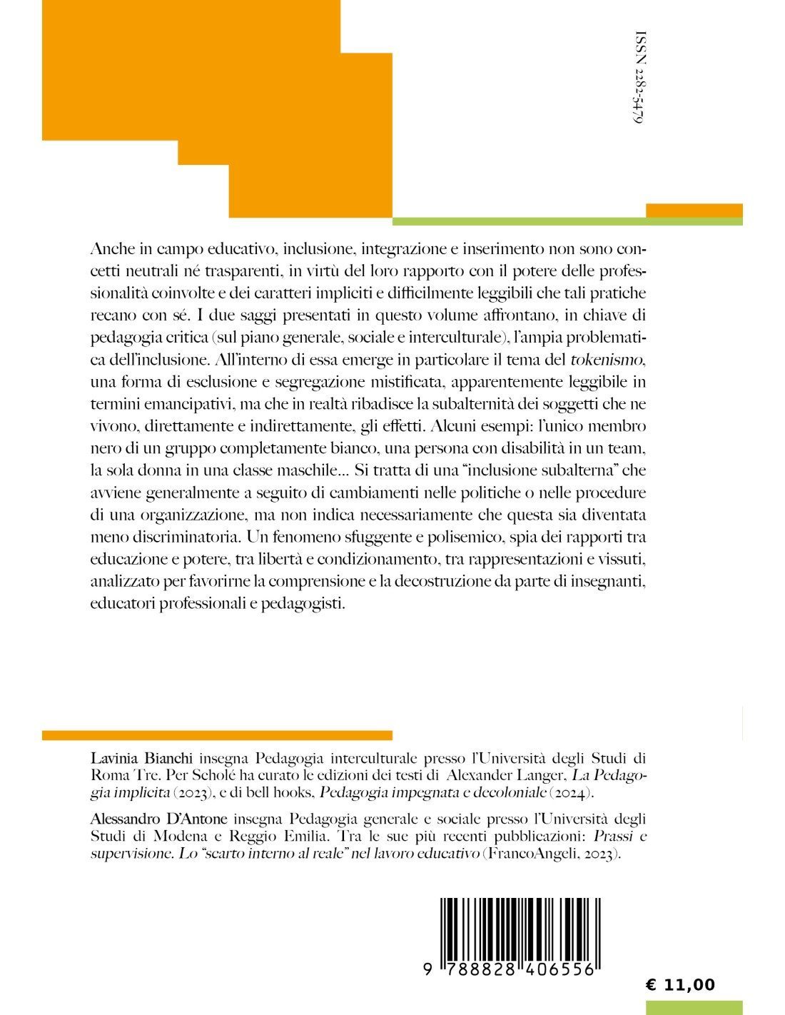 Anche in campo educativo, inclusione, integrazione e inserimento non sono concetti neutrali né trasparenti, in virtù del loro rapporto con il potere delle professionalità coinvolte e dei caratteri impliciti e difficilmente leggibili che tali pratiche recano con sé. I due saggi presentati in questo volume affrontano, in chiave di pedagogia critica (sul piano generale, sociale e interculturale) l’ampia problematica dell’inclusione. All’interno di essa emerge in particolare il tema del tokenismo, una forma di esclusione e segregazione mistificata, apparentemente leggibile in termini emancipativi, ma che in realtà ribadisce la subalternità dei soggetti che ne vivono, direttamente e indirettamente, gli effetti. Alcuni esempi: l’unico membro nero di un gruppo completamente bianco, una persona con disabilità in un team, la sola donna in una classe maschile… Una “inclusione subalterna” che avviene generalmente a seguito di cambiamenti nelle politiche o nelle procedure di una organizzazione, ma non indica necessariamente che questa sia diventata meno discriminatoria. Un fenomeno sfuggente e polisemico, spia dei rapporti tra educazione e potere, tra libertà e condizionamento, tra rappresentazioni e vissuti, analizzato per favorirne la comprensione e la decostruzione da parte di insegnanti, educatori professionali e pedagogisti.