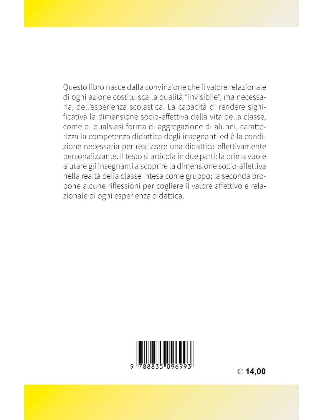 Questo libro nasce dalla convinzione che il valore relazionale di ogni azione costituisca la qualità “invisibile”, ma necessaria, dell’esperienza scolastica. La capacità di rendere significativa la dimensione socio-effettiva della vita della classe, come di qualsiasi forma di aggregazione di alunni, caratterizza la competenza didattica degli insegnanti ed è la condizione necessaria per realizzare una didattica effettivamente personalizzante. Il testo si articola in due parti: la prima vuole aiutare gli insegnanti a scoprire la dimensione socio-affettiva nella realtà della classe intesa come gruppo; la seconda propone alcune riflessioni per cogliere il valore affettivo e relazionale di ogni esperienza didattica.