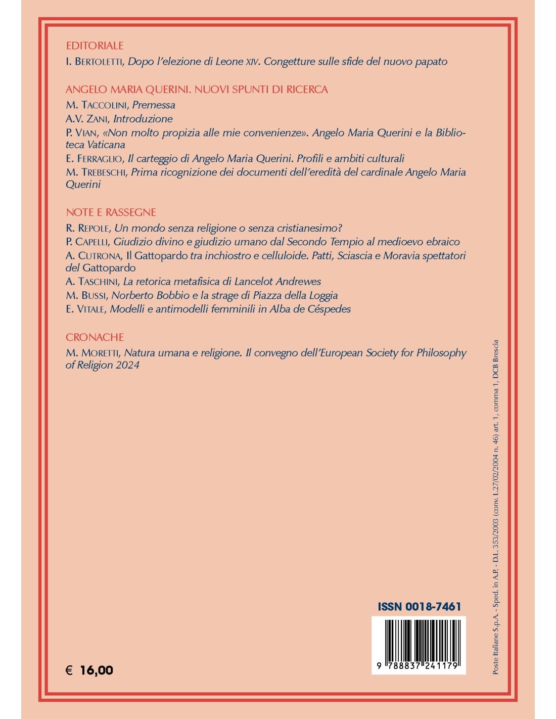 Il fascicolo raccoglie alcuni dei contributi presentati durante la Giornata di Studi Queriniani organizzata il 1° dicembre del 2023 dall’Università Cattolica del Sacro Cuore e dall’Archivio Storico Diocesano di Brescia con l’intento di rinnovare, anche in termini di aggiornamento storiografico, la memoria e gli studi relativi al Cardinale Angelo Maria Querini (1680-1755).