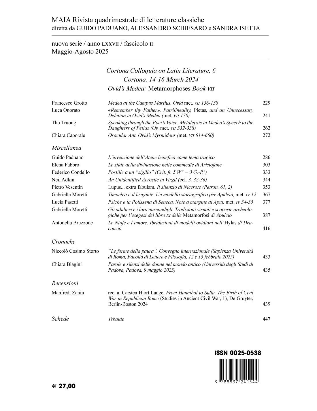 This issue opens with a selection of papers presented at the 6th Cortona Colloquium on Latin Literature (14–16 March 2024), which focused on Ovid's Medea: Metamorphoses, Book VII. These papers examine innovative aspects of the story of Medea, to which Ovid dedicates verses 1–424 of Book VII of the Metamorphoses. They address philological and interpretative problems, identifying strategies of rhetorical and intertextual manipulation, as well as situations of metalepsis, i.e. violations of narrative levels, which highlight how, in certain cases, Medea's narrative presence influences the narrator.