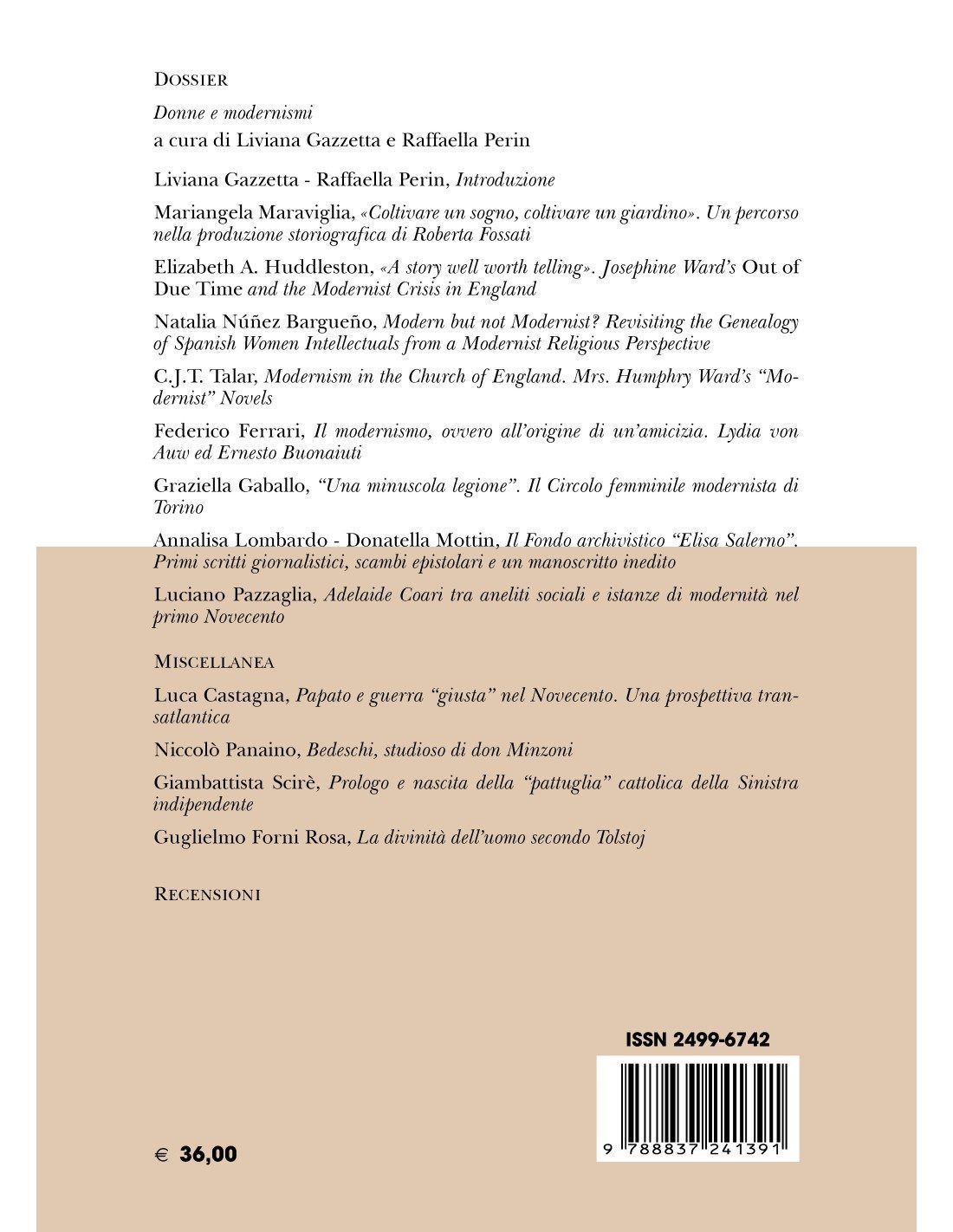 Il numero monografico dedicato a Donne e modernismi esplora il ruolo delle donne nel contesto del modernismo religioso, mettendo in evidenza la loro partecipazione e il loro contributo alla riforma della Chiesa cattolica tra XIX e XX secolo. Il modernismo femminile presenta caratteristiche specifiche, diverse da quelle del modernismo maschile, e richiede pertanto una riconsiderazione delle categorie interpretative e delle prospettive storiografiche tradizionali. I saggi raccolti offrono uno sguardo sul modernismo al femminile, contribuendo a ridefinirne i confini e ad ampliarne l’orizzonte analitico, includendo dinamiche religiose e spirituali nonché esperienze letterarie.